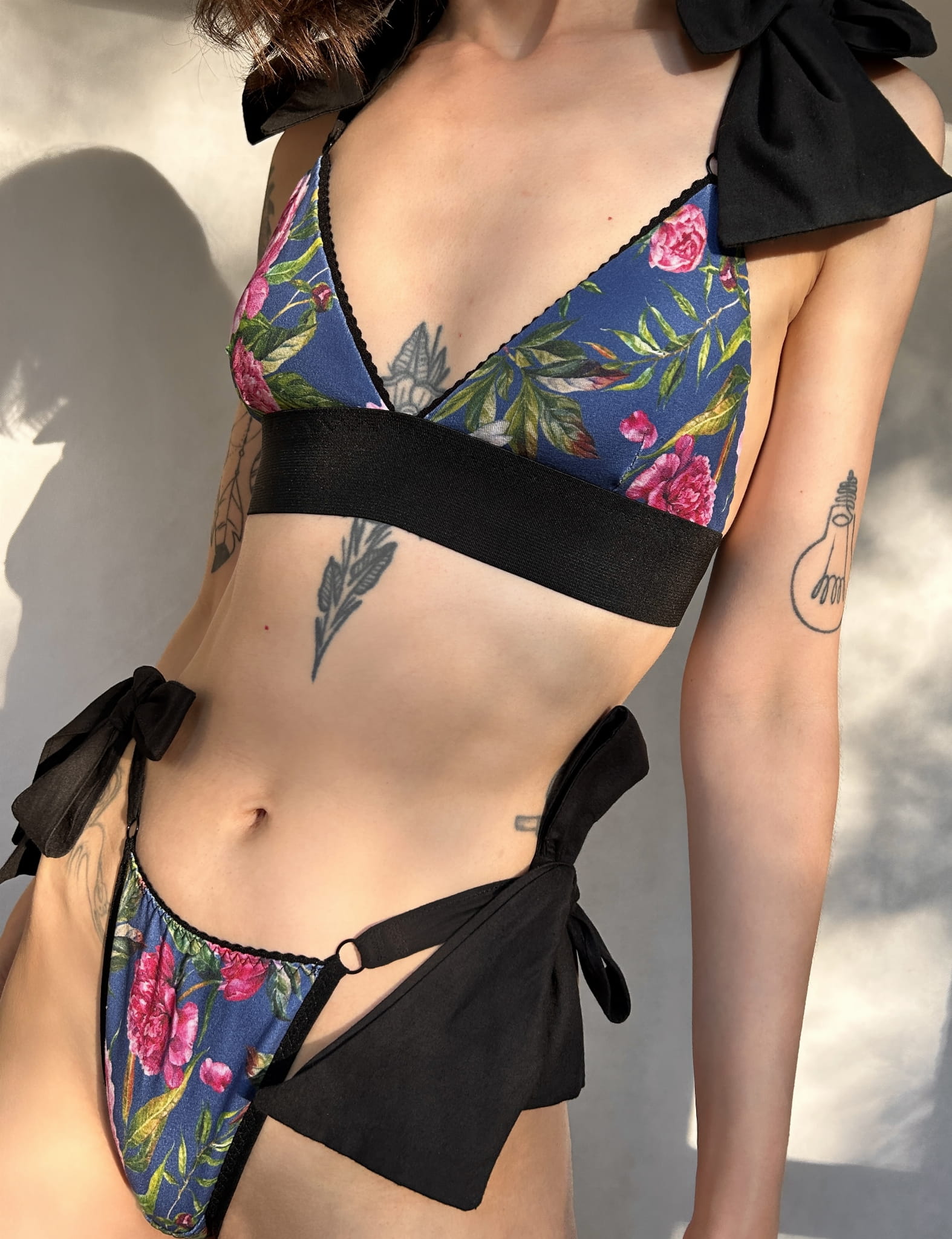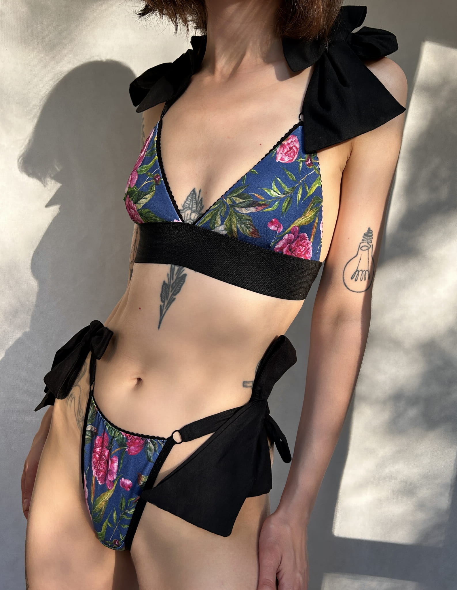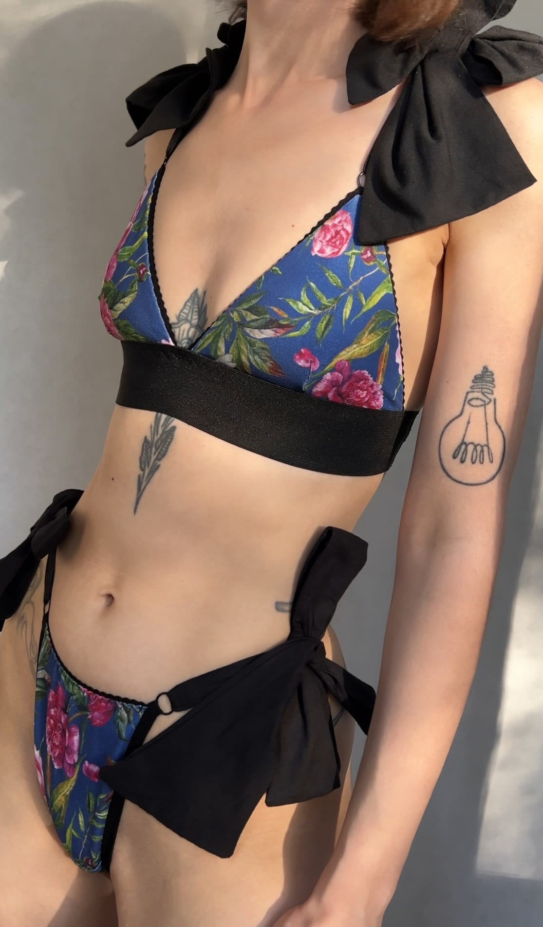 Bikini wykonane z prążkowanej, drukowanej wiskozy w kwiaty i bawełny.