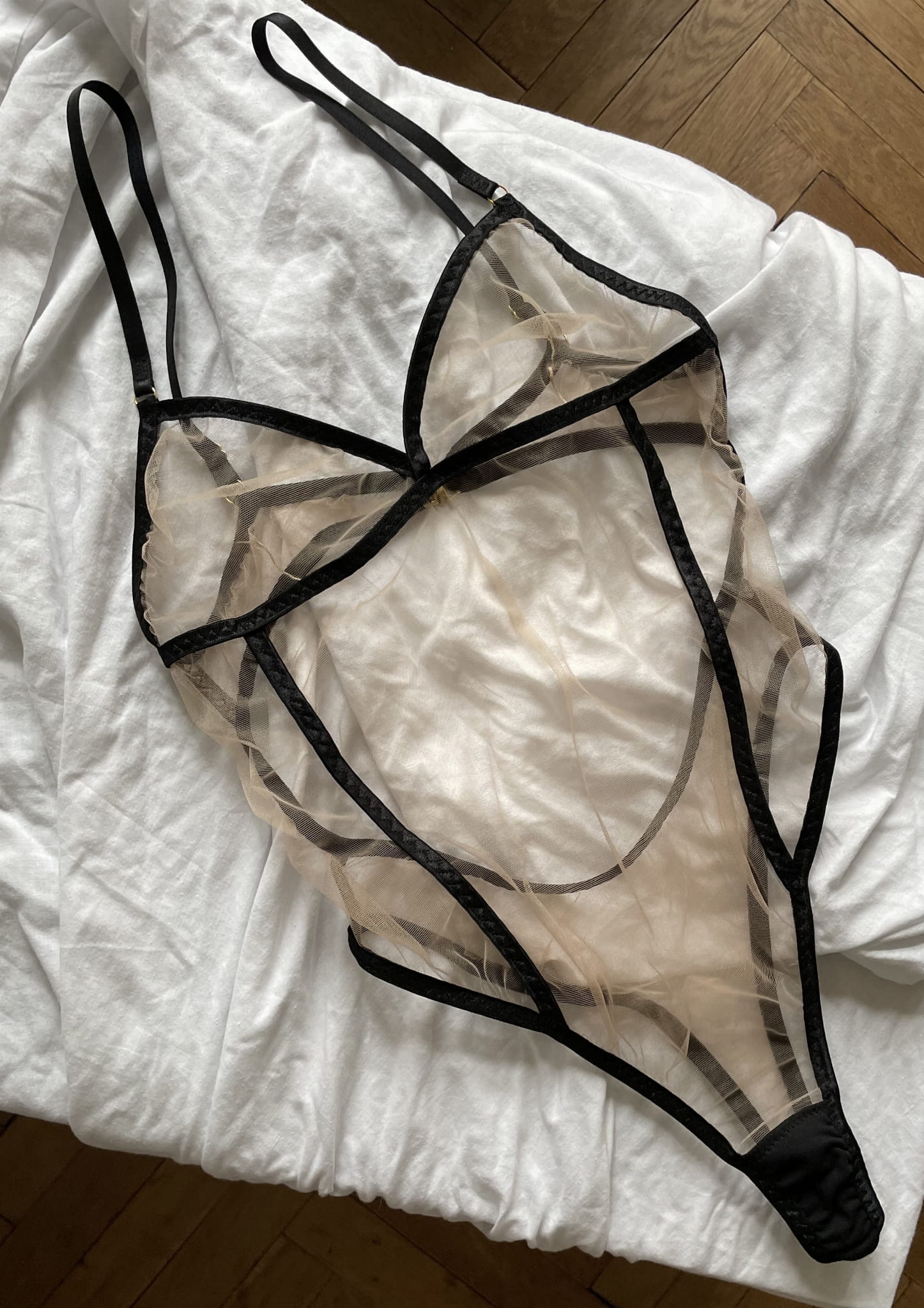 Body wykonane z włoskiego, elastycznego i przeźroczystego tiulu z odpinanymi paskami do pończoch.