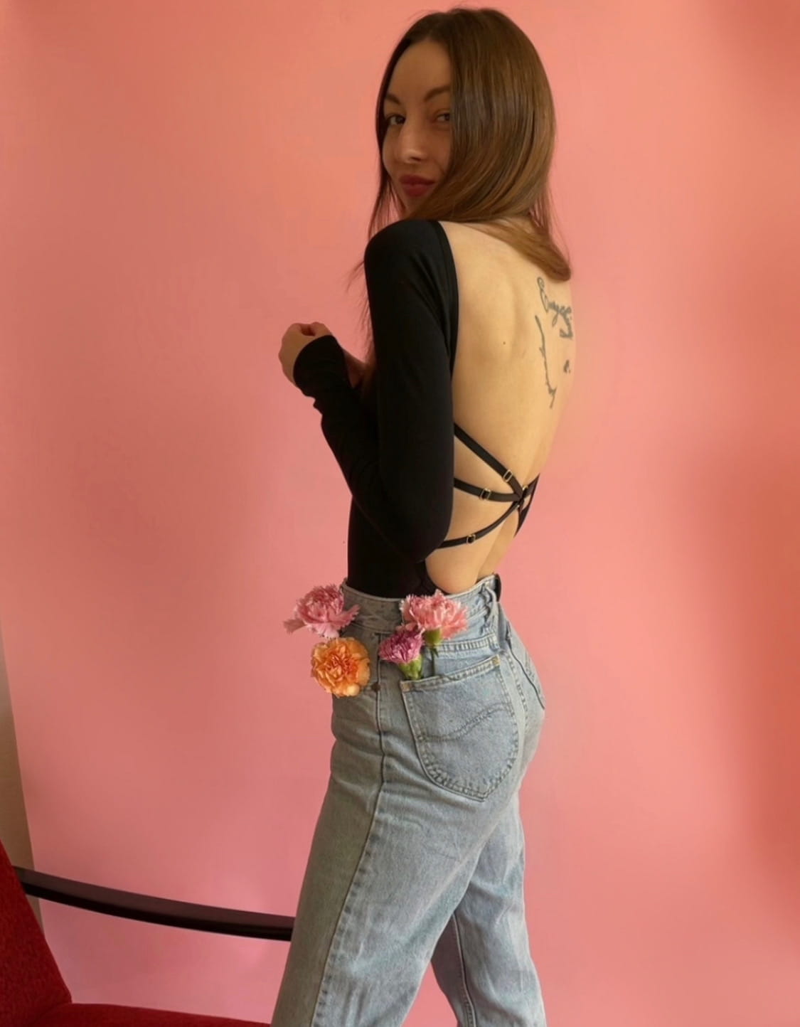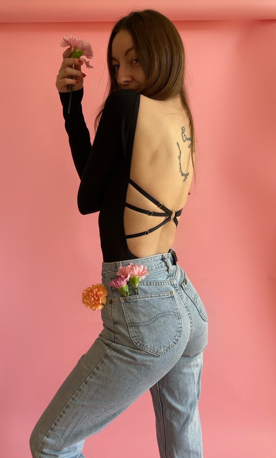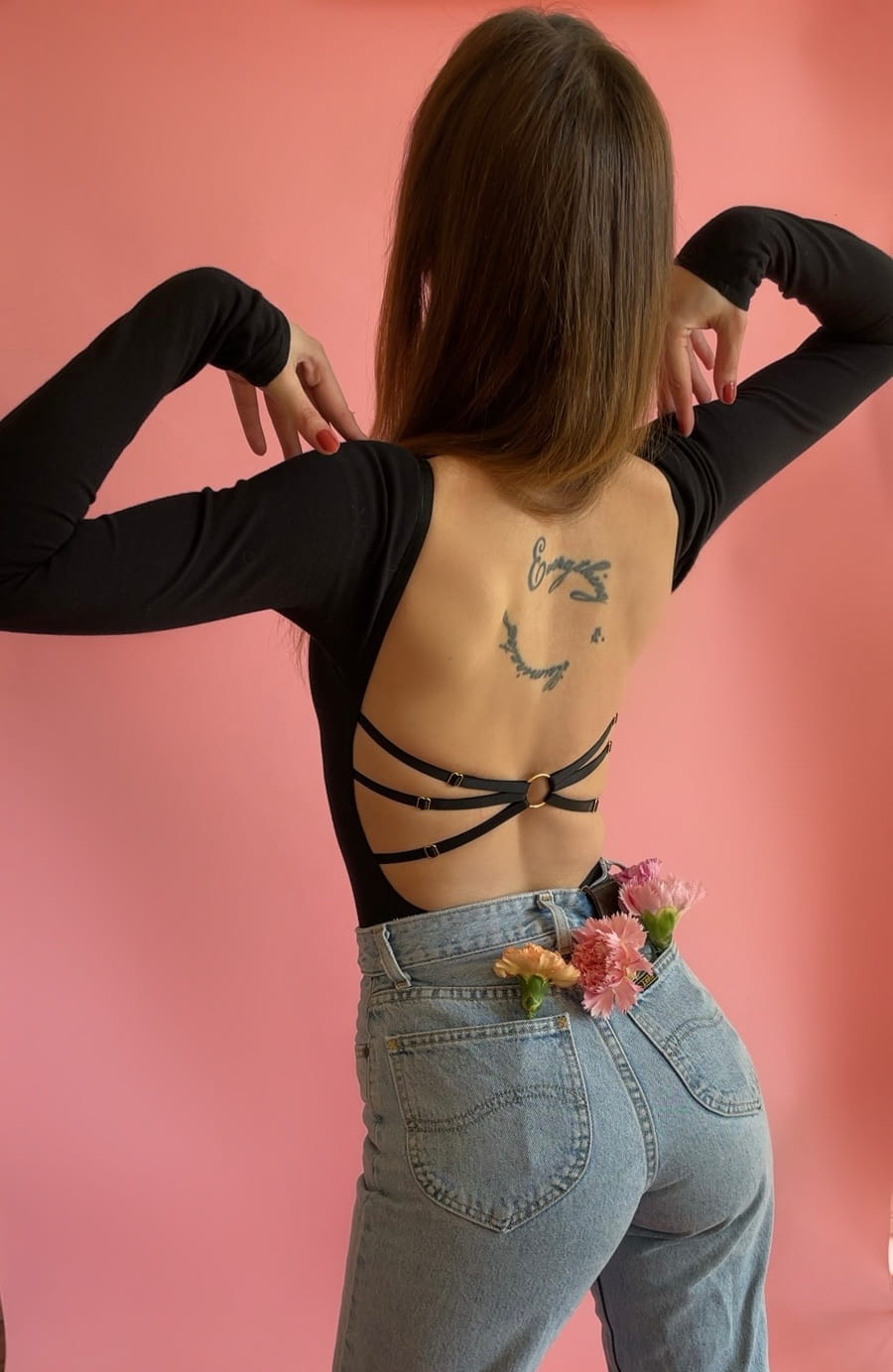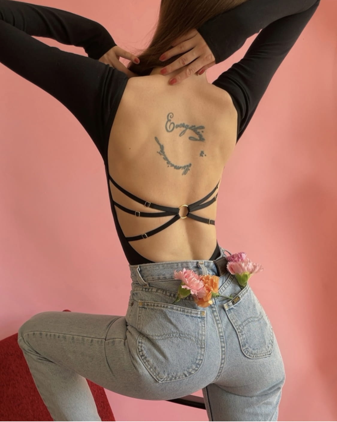 - Wycięte plecy i ozdobne regulowane paski na plecach.