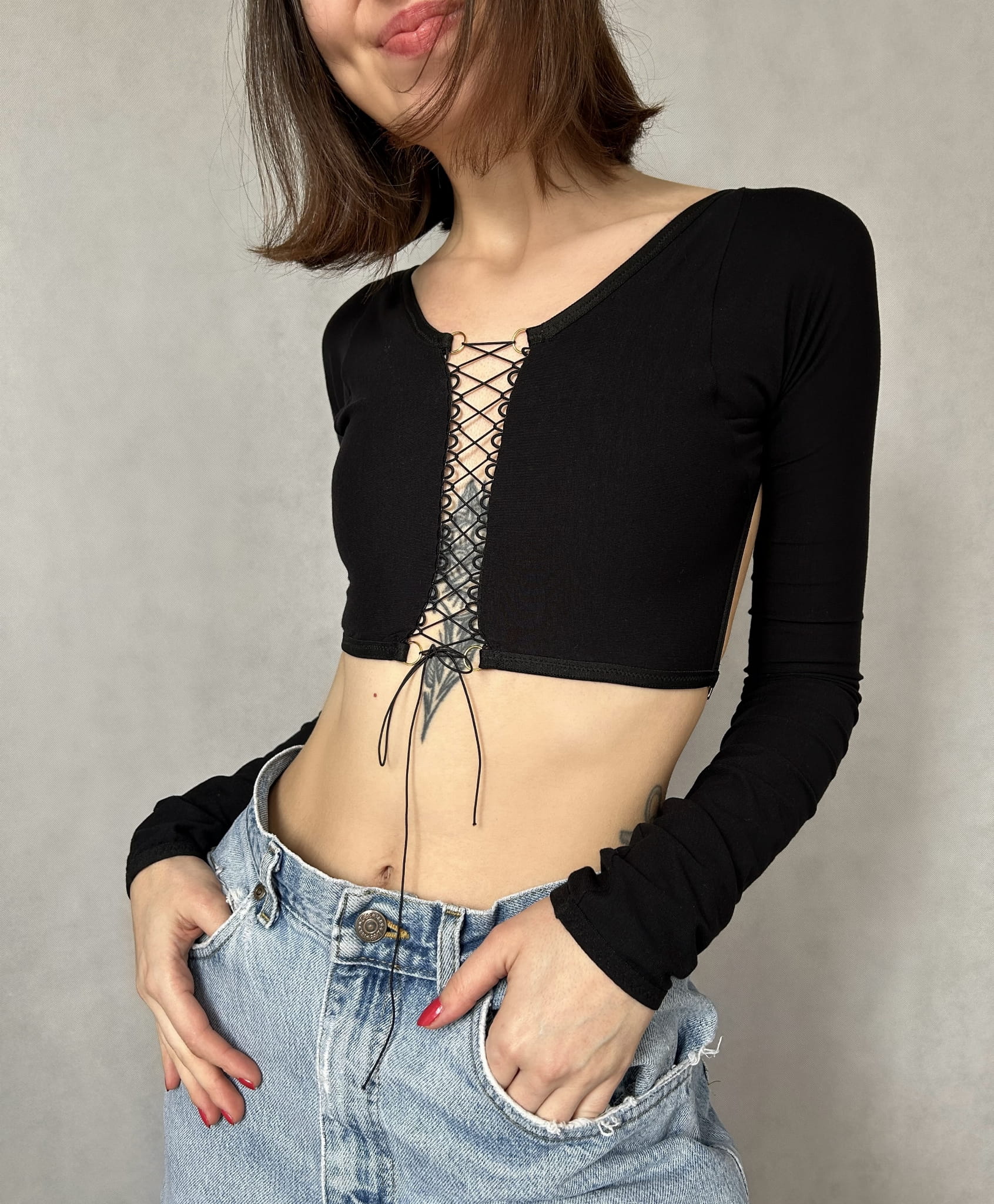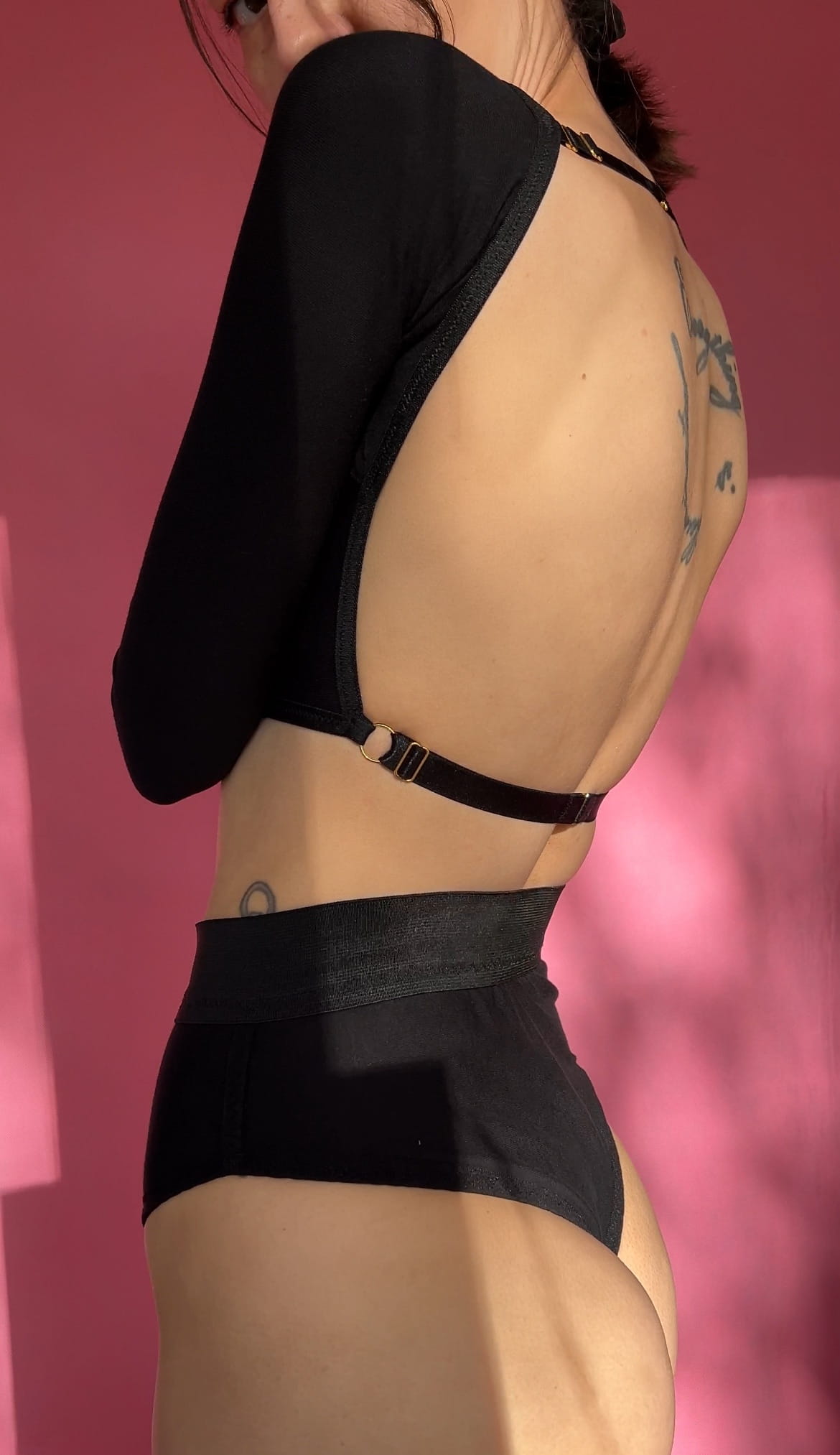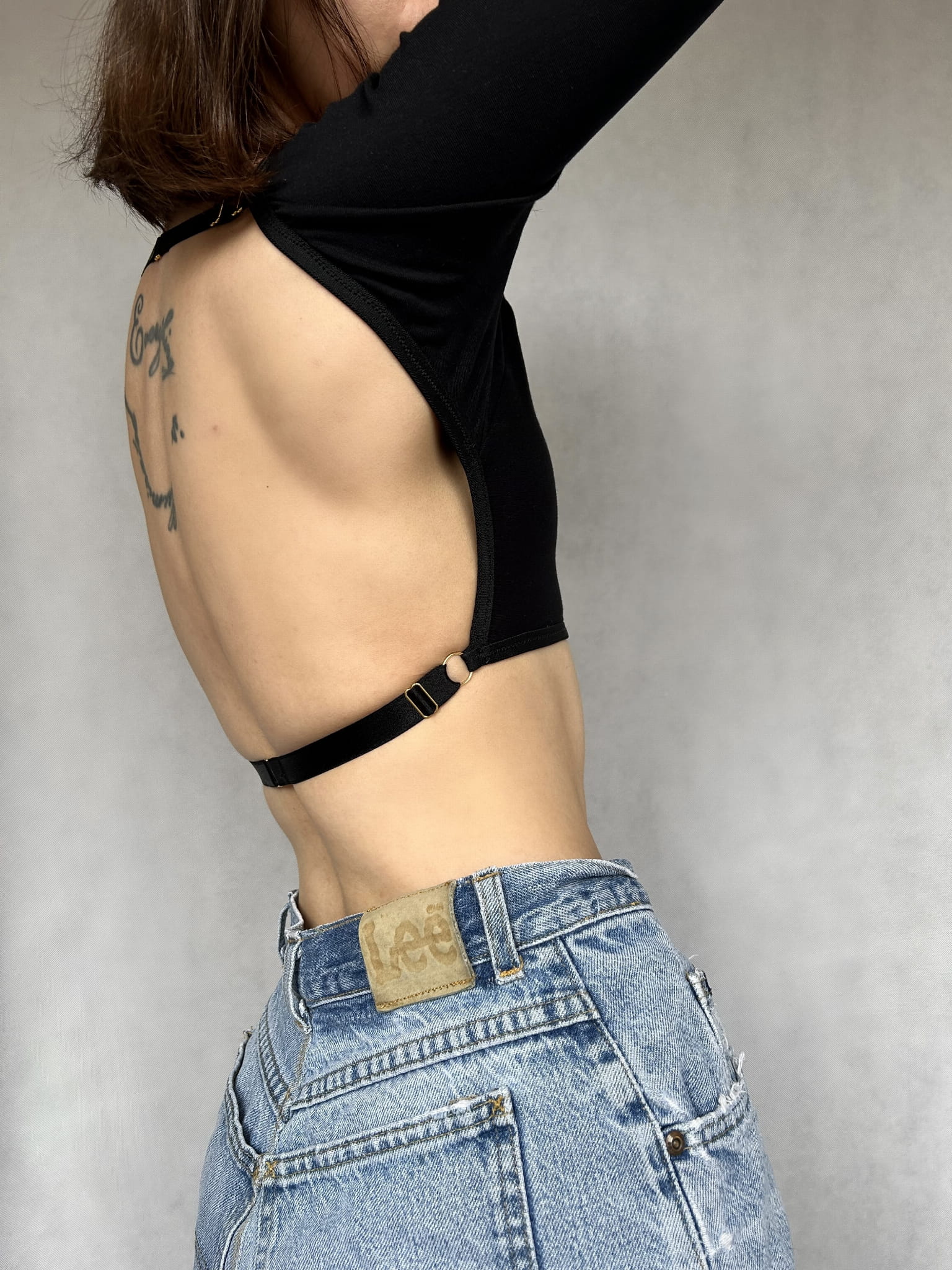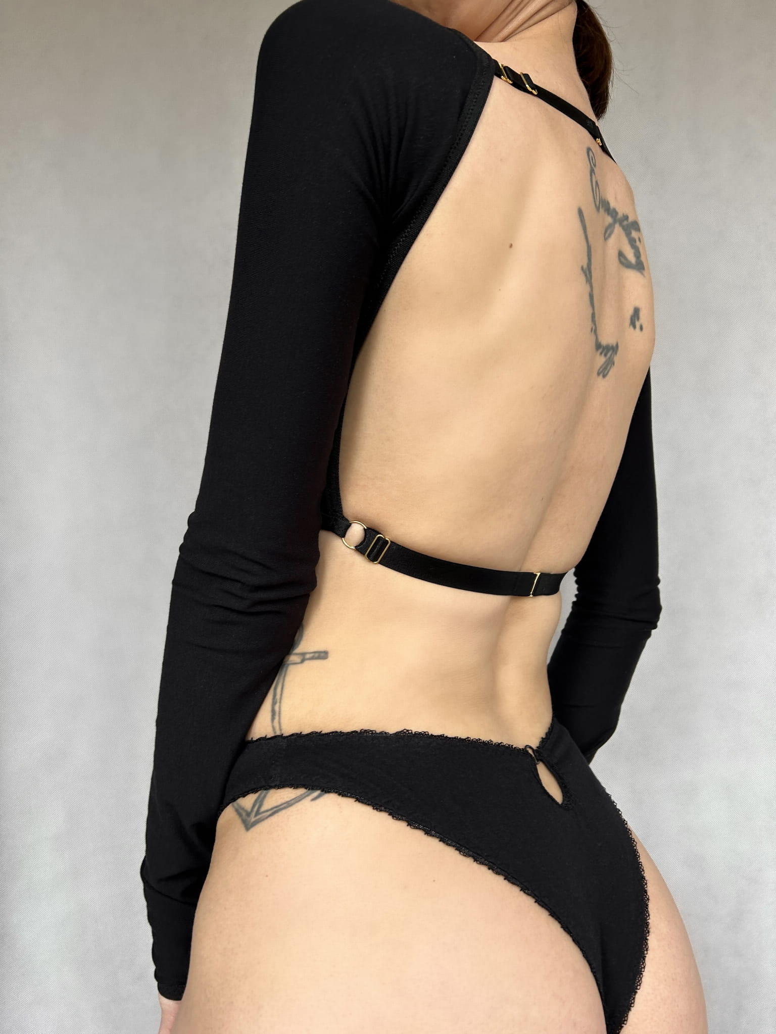 - Odkryte plecy z regulowanym, ozdobnym zapięciem.