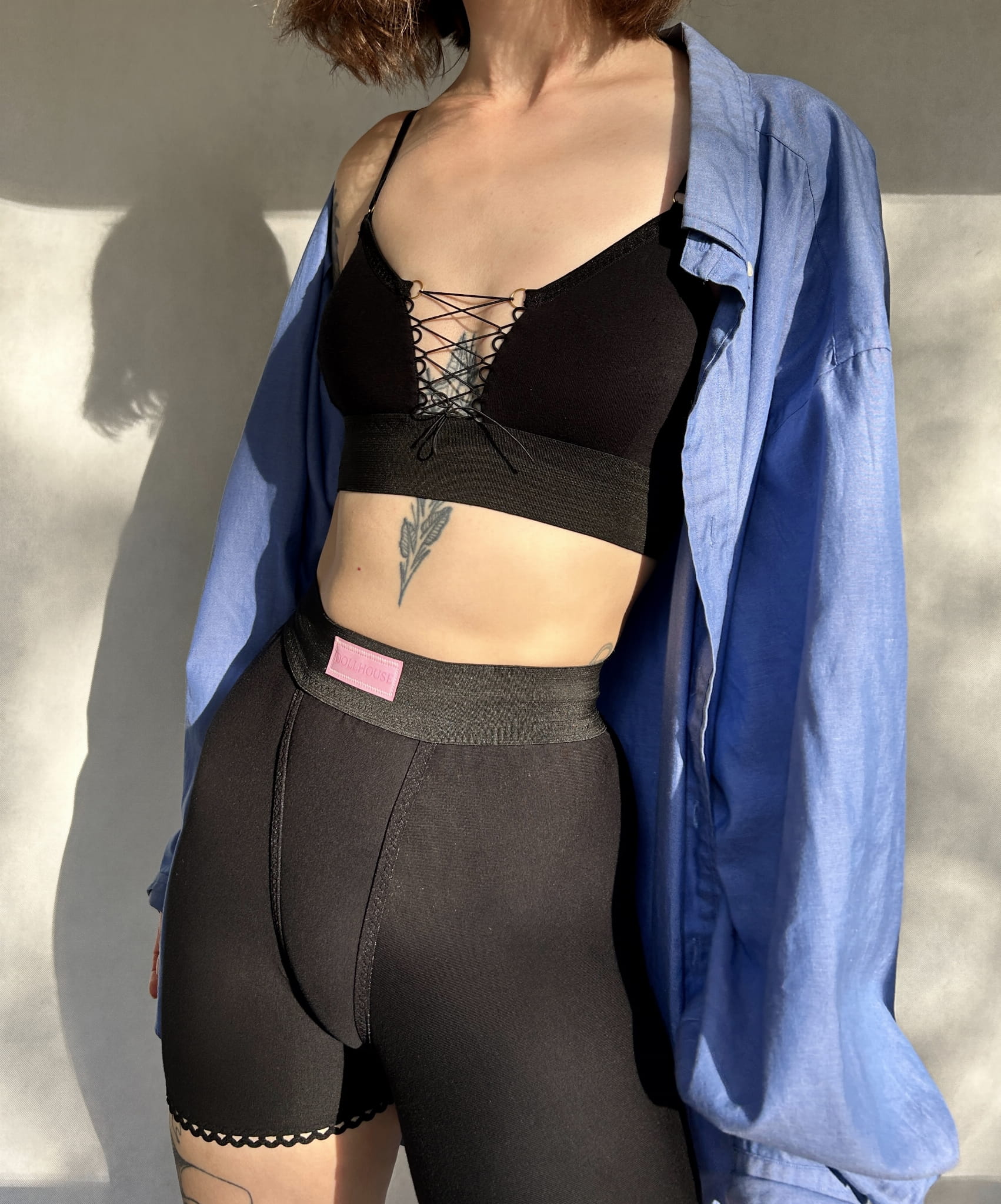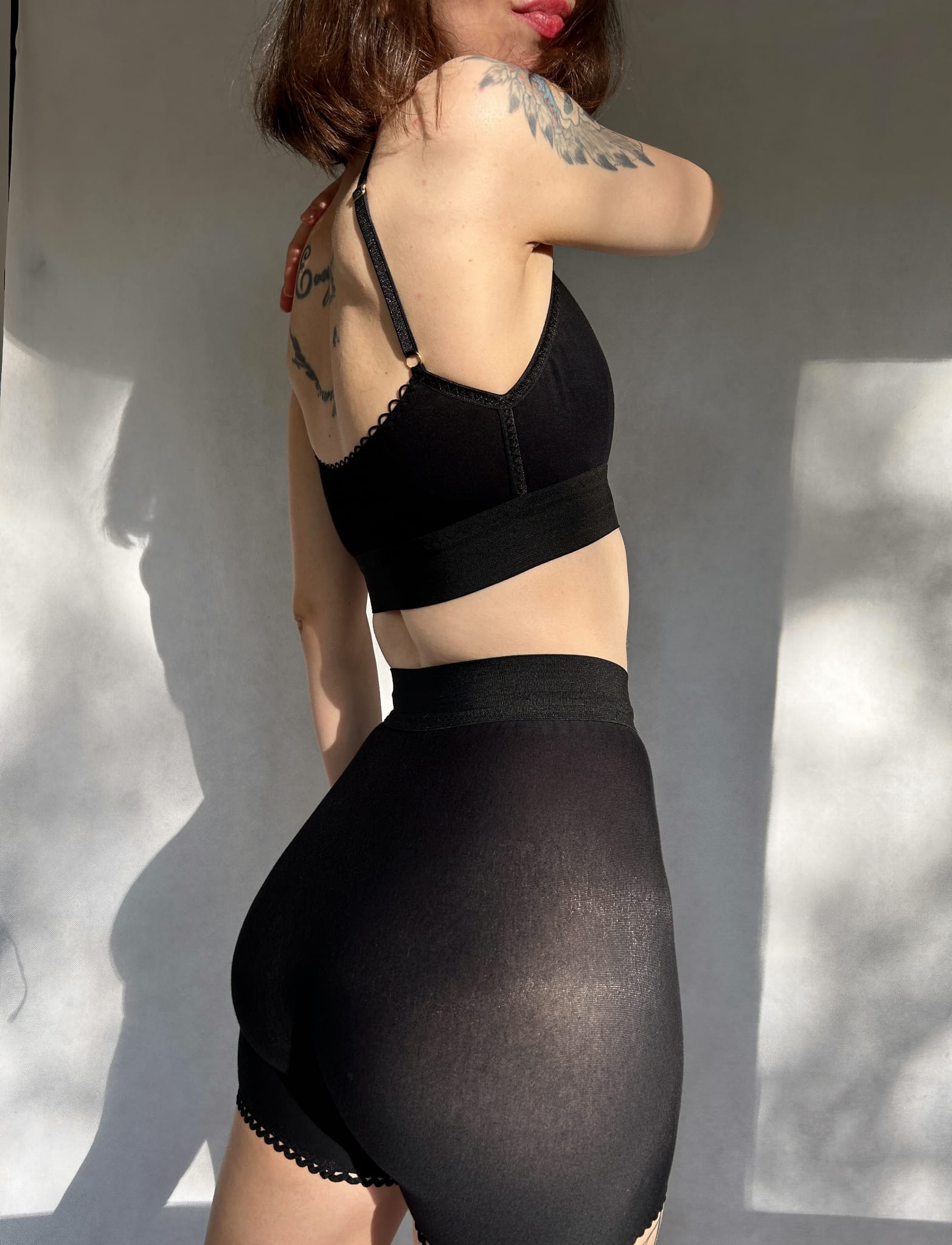 - Bokserki z wysokim stanem, wykończone miękką gumokoronką z podwónym materiałem z panelu z przodu.