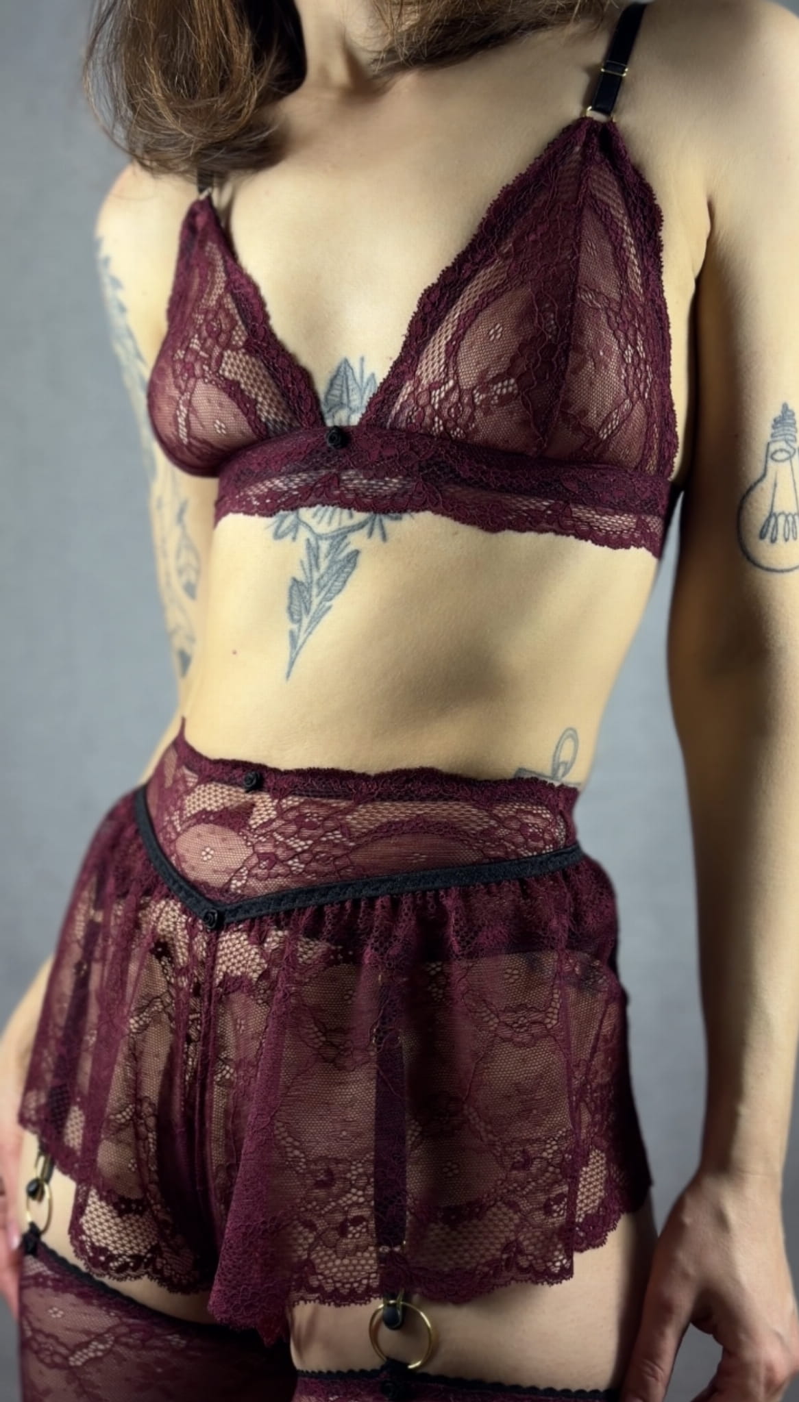 W skład zestawu wchodzą bralet, pas, szorty i dwie podwiązki podnoszące pośladki