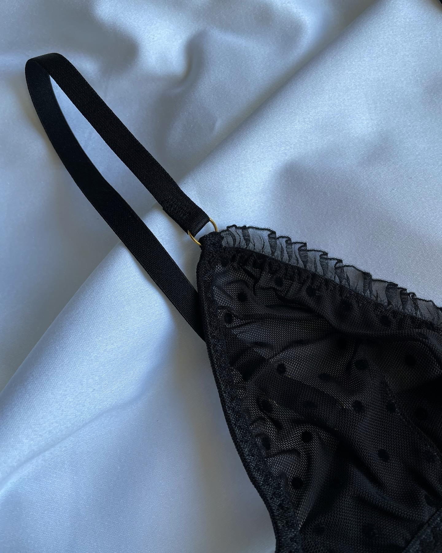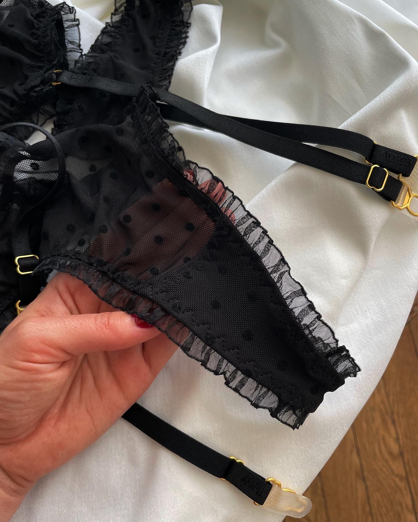 Zestaw wykonany z miękkiego tiulu w groszki, wykończony ozdobną gumokoronką.